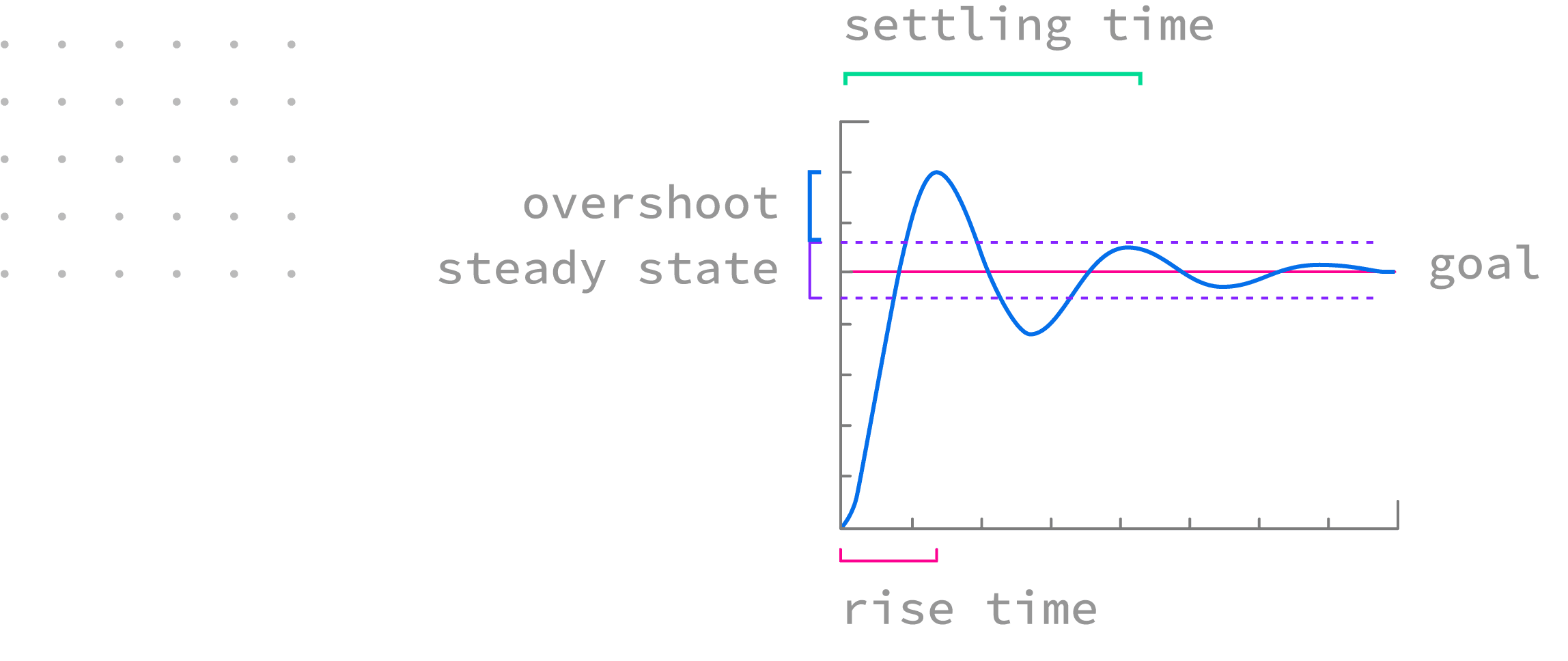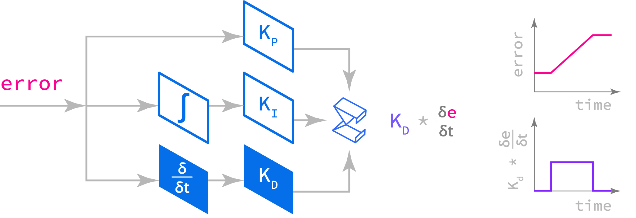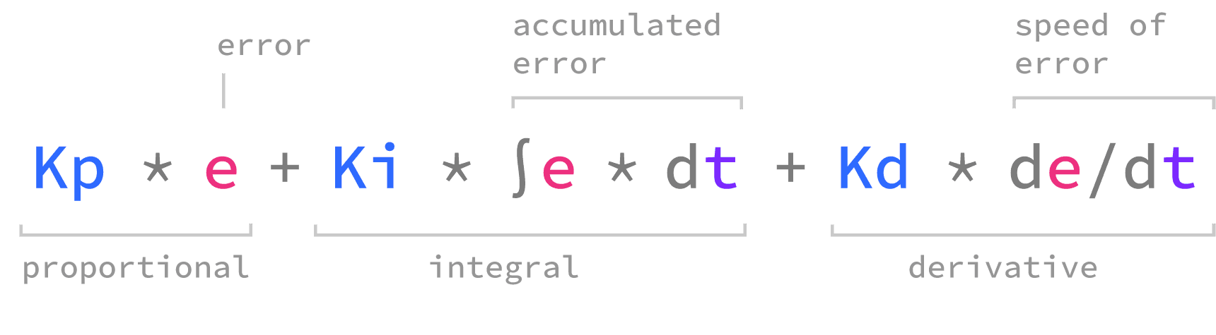 - Derivative term: simulates friction, gradually “applying brakes” when in danger of over-correcting.