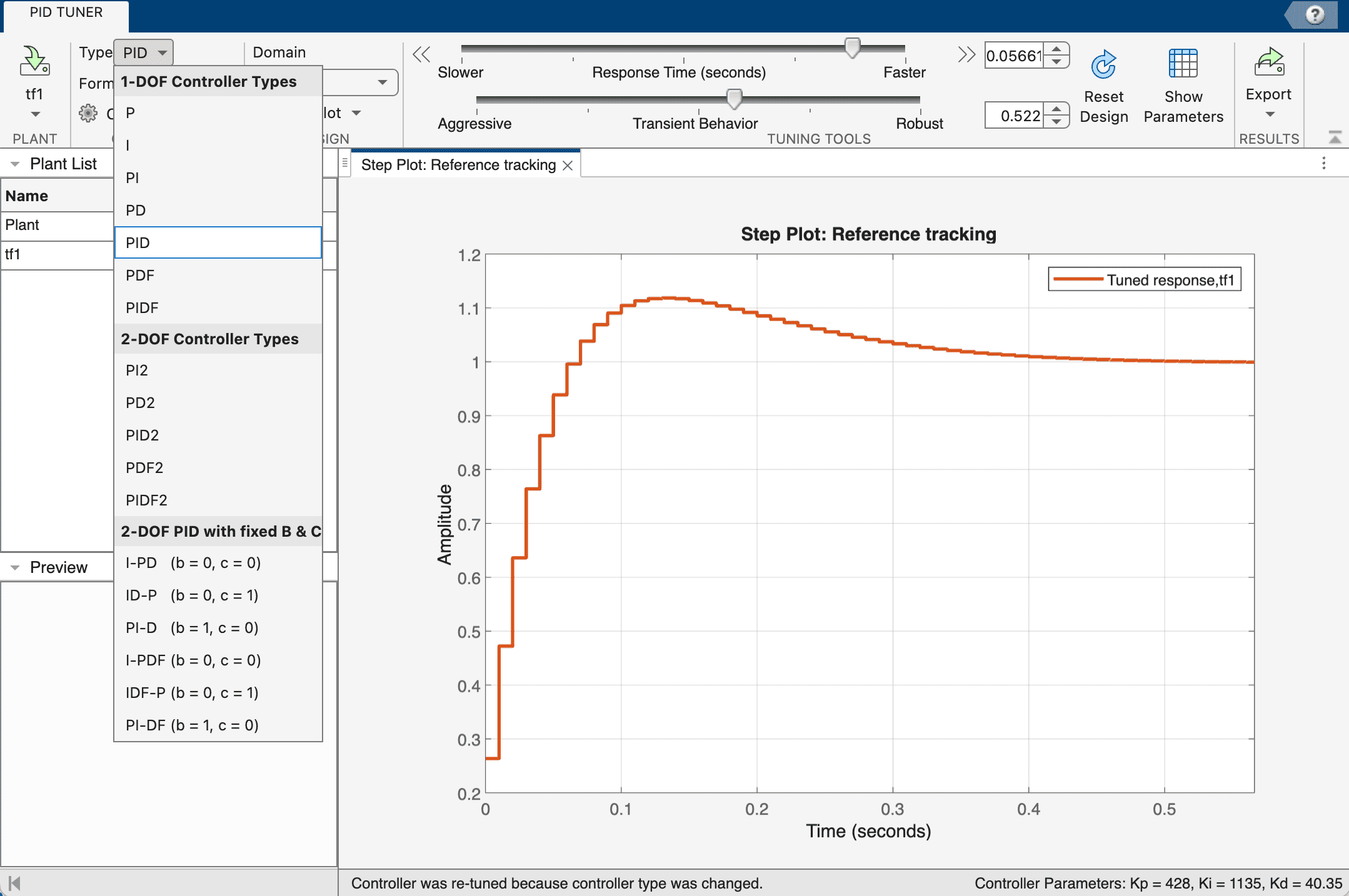 Change the controller Type in the dropdown, and use the sliders to set the requirements for the controller performance: