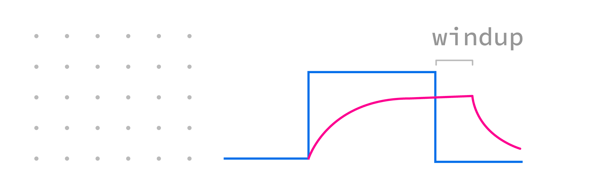 As seen before, the integral term acts like a coiled spring: the longer it takes for the controller to reach its goal, the more tightly it’s wound up.