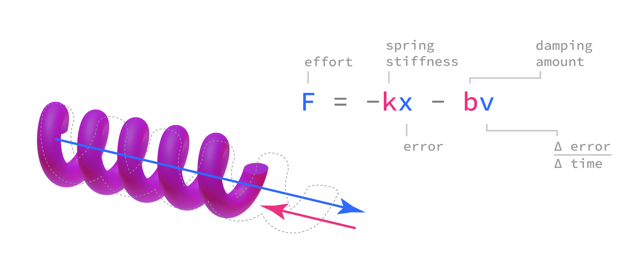 Indeed, a PID controller is nothing more than a synthetic spring that “stretches” when the measurement is too far from the desired value, with “stiffness” defined by Kp and “damping” by Kd.
