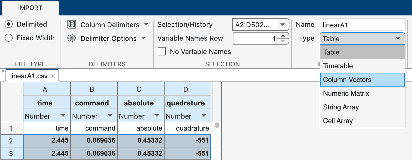 In the Import Data dialog that opens, type in the names of the workspace variables corresponding to the imported column vectors: