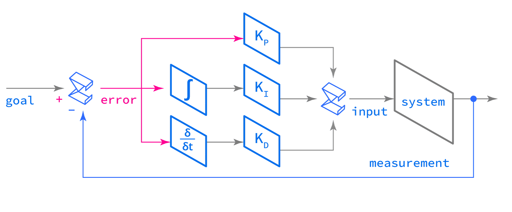 The Kp, Ki, and Kd weights applied to each term are called gains, and they are used to tune the overall behavior of the controller: